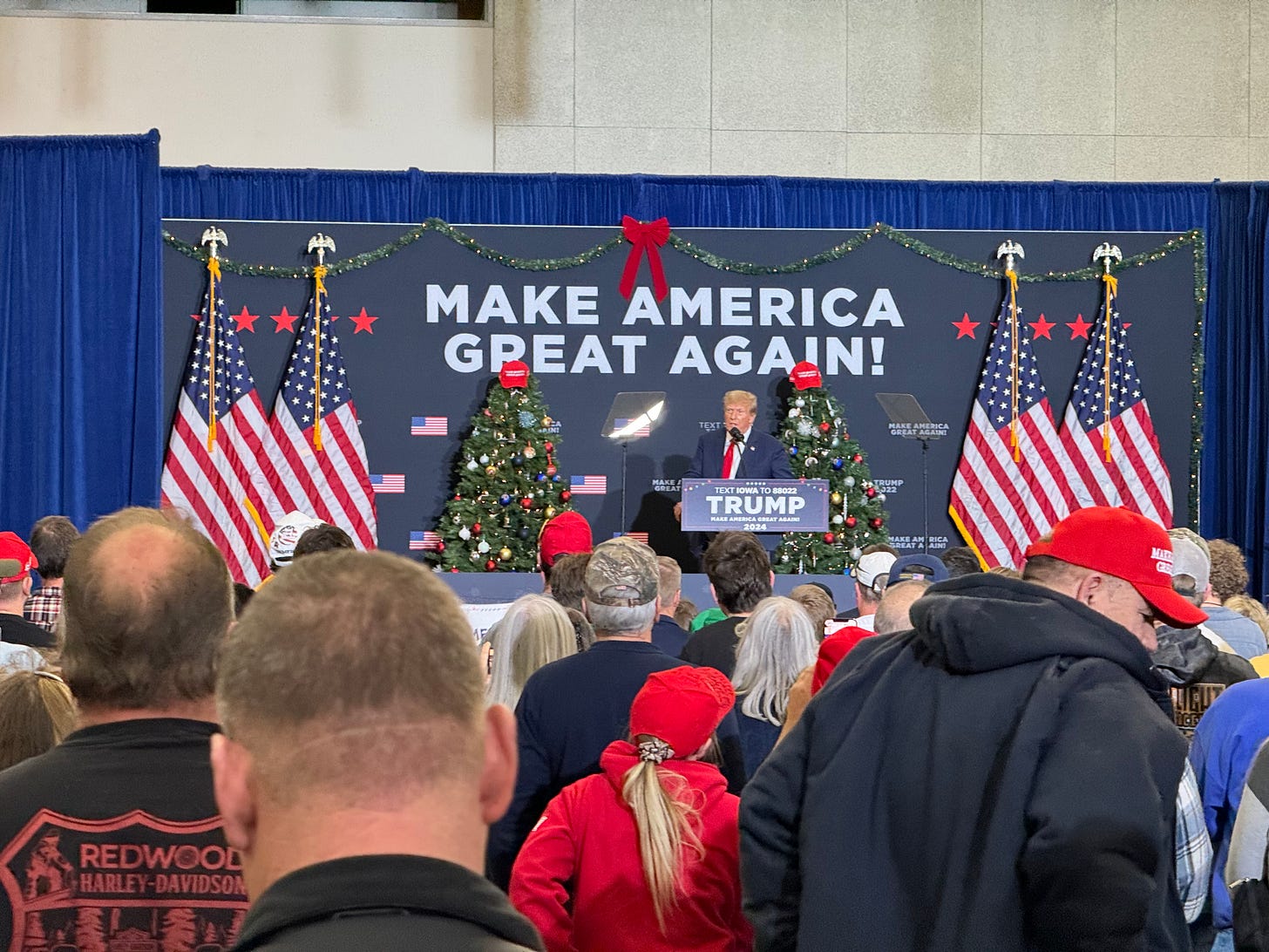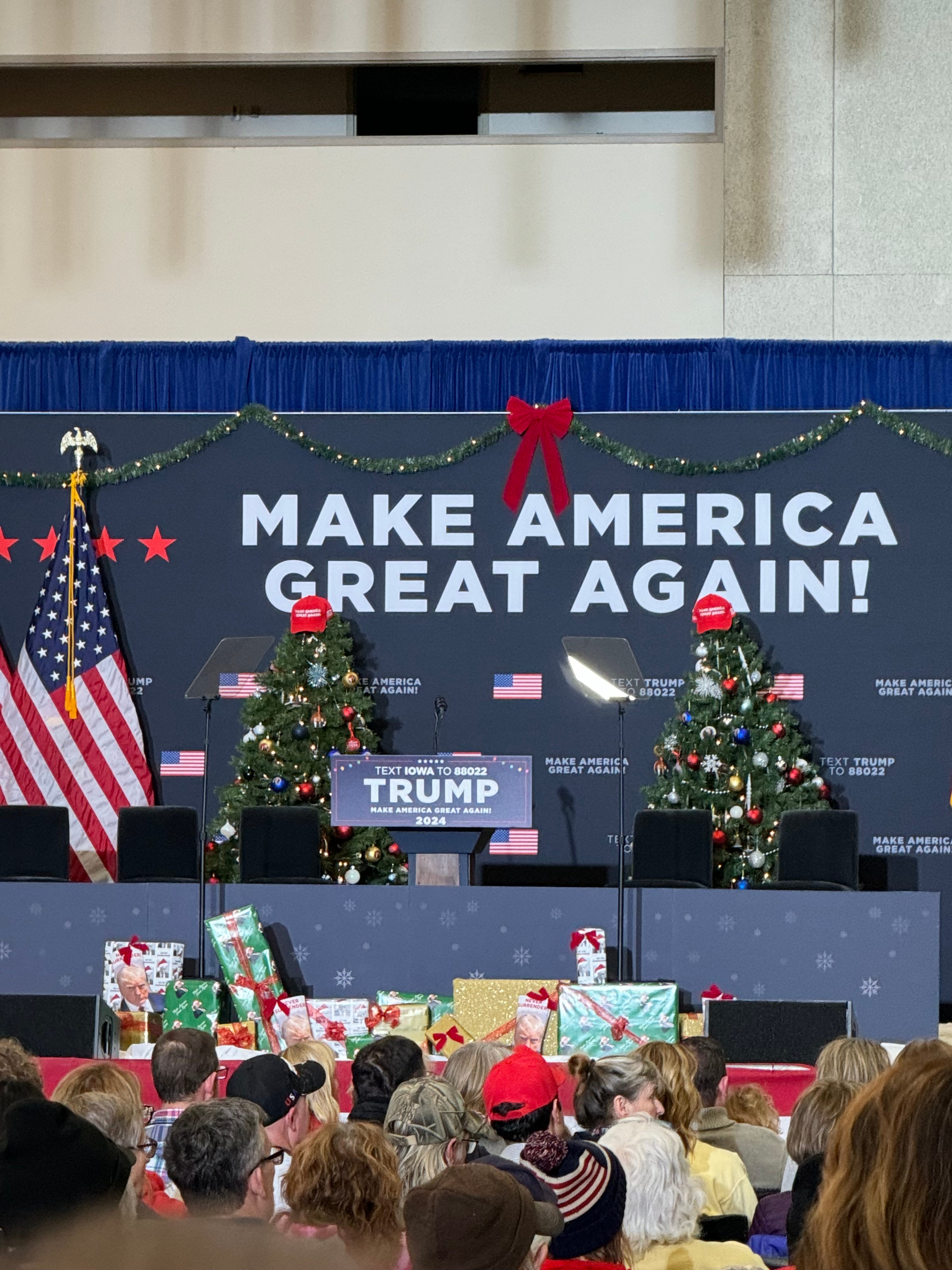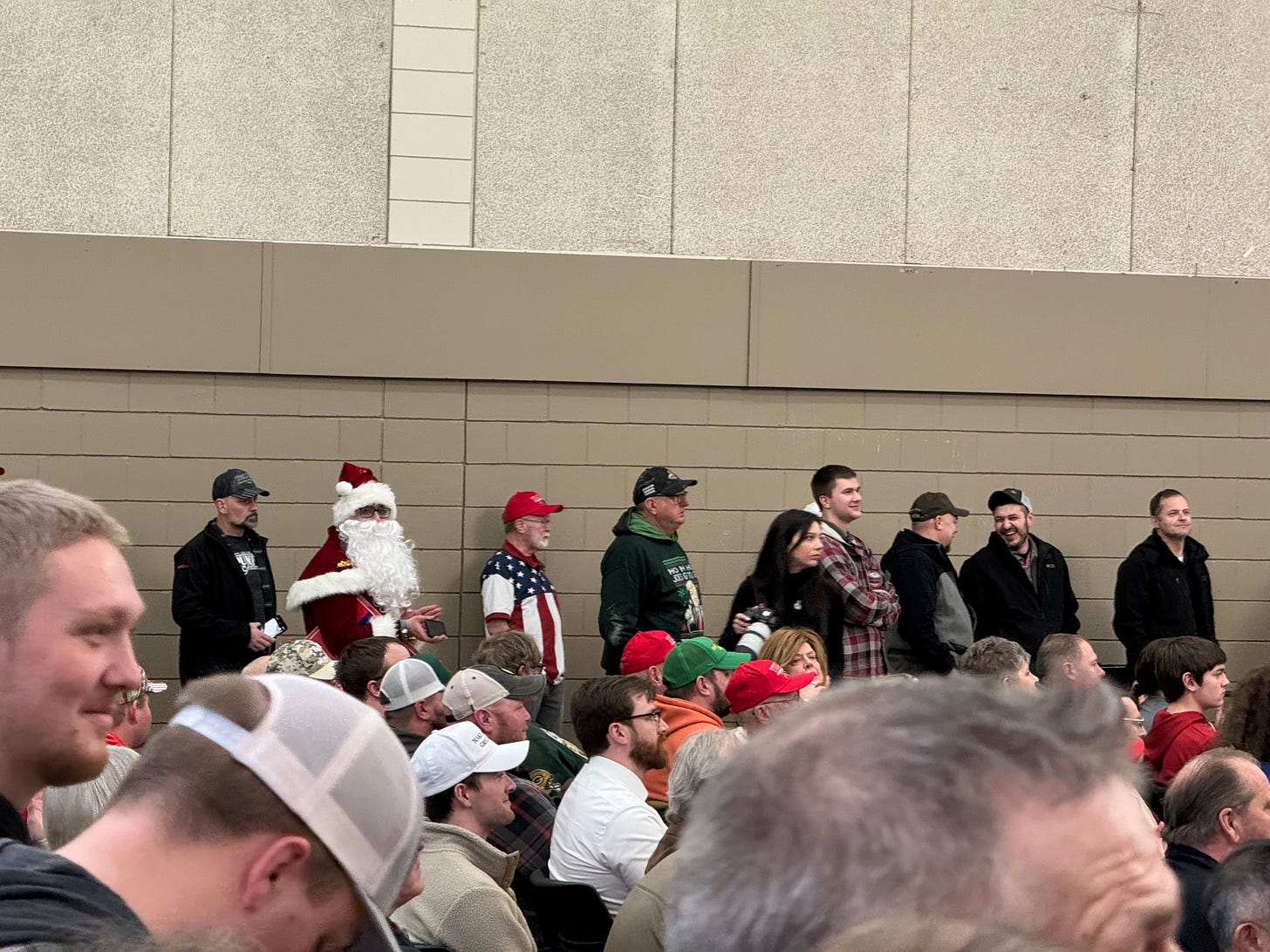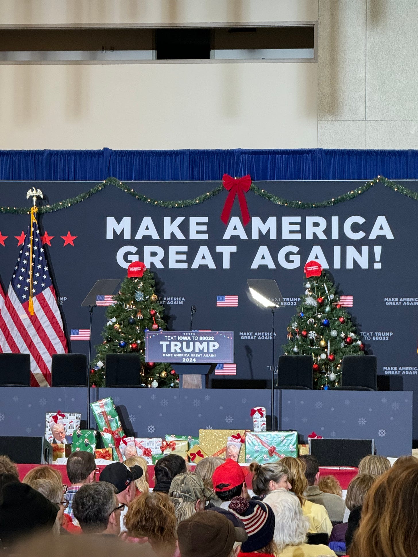 “You don't even have to convince people to support President Trump here in Iowa, do we? The support is so strong,” Iowa State Attorney General Brenna Bird said at Trump’s rally, pointing to a man dressed as Santa Claus who walked around the rally holding a Christmas-themed campaign sign. “Even Santa Claus is here supporting President Trump.”